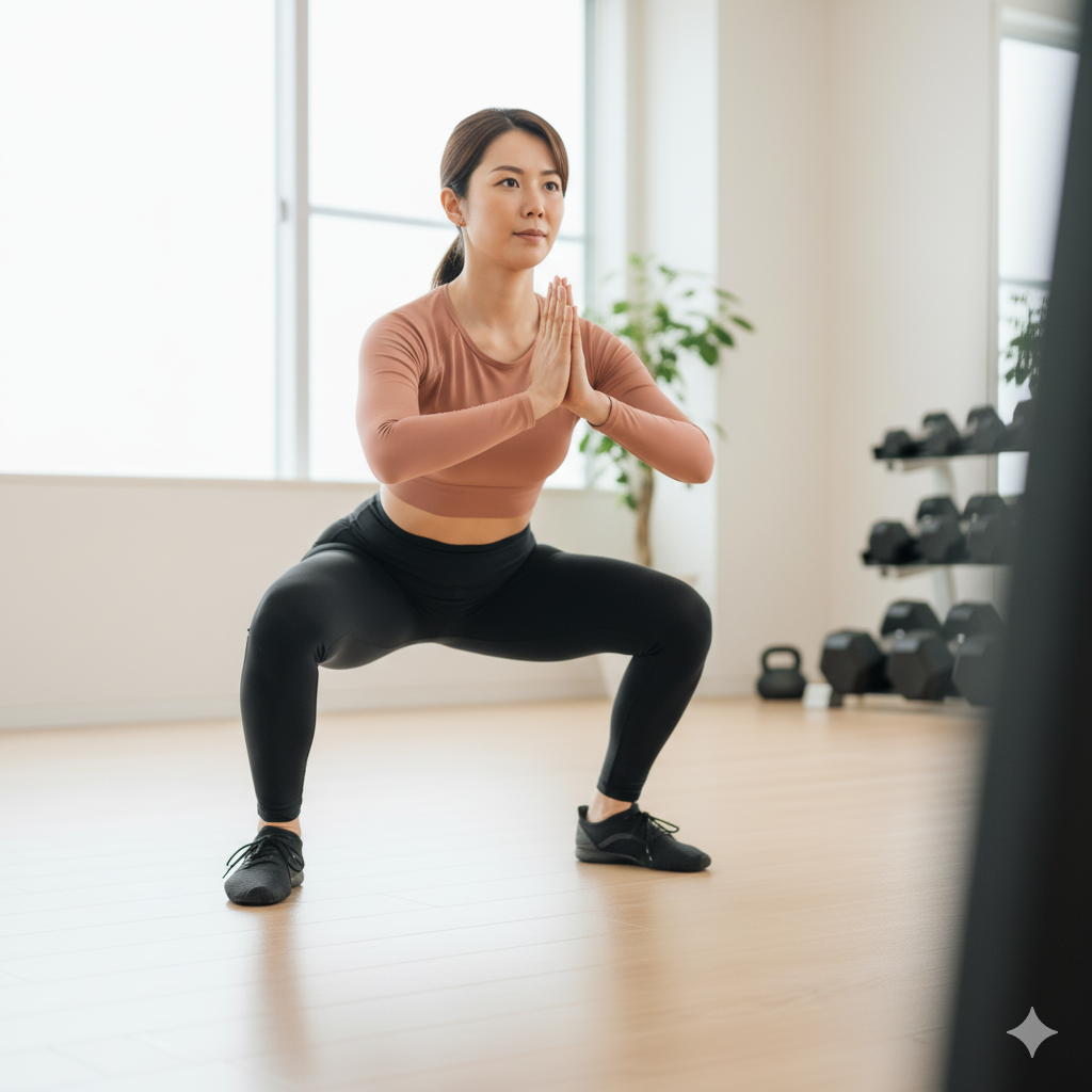 ②30秒ほどかけてゆっくり腰を下げ、15秒ほどで元に戻します。