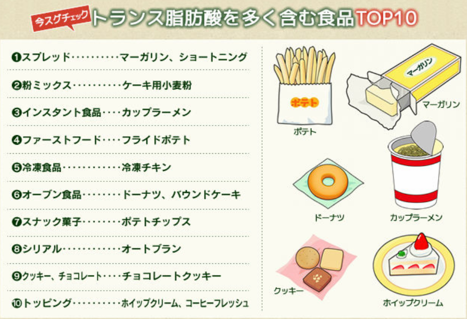- 【太る油】:マーガリン、ショートニングに多い「トランス脂肪酸」は避ける!